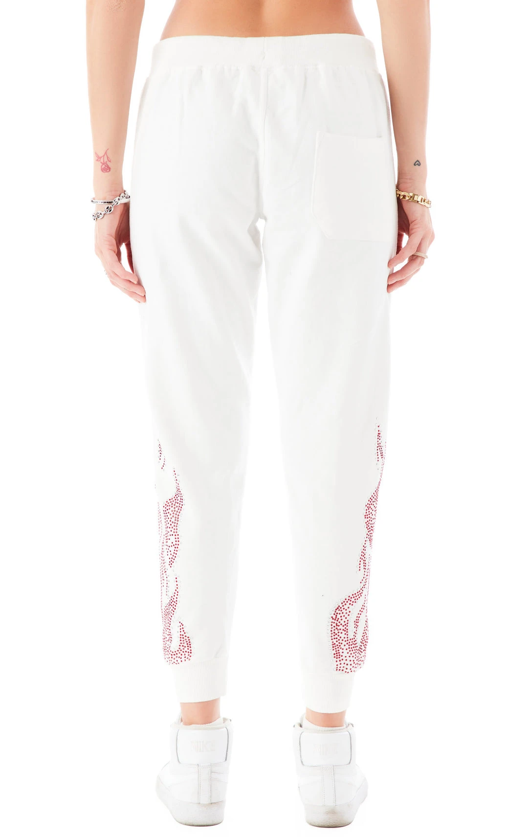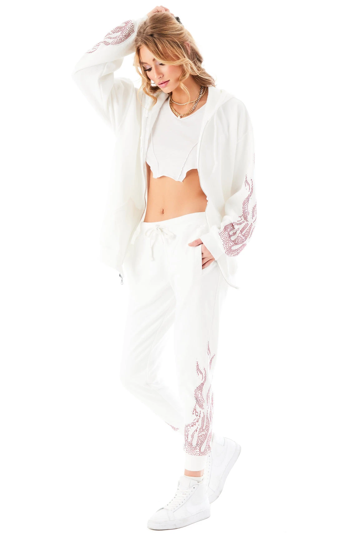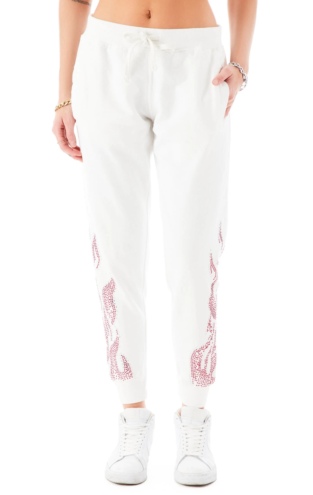 Turn up the heat on your weekday fits. These ultra comfy sweatpants are meant to sit on the hip with a soft ribbed hem, drawstring waist, and pockets. We’re obsessed with the killer flame rhinestone embellishment on the bottom. These cozy sweatpants will fire you up.