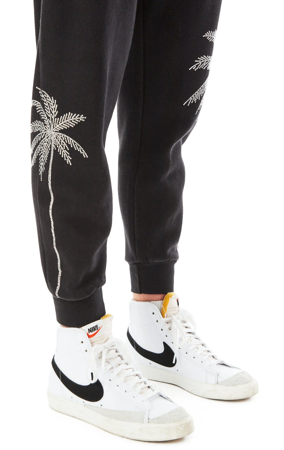 Mood: Extra blingy. Serve looks when you strut in these relaxed fit black sweatpants featuring rhinestone palm trees on the pant legs. Perfect to pair with our matching rhinestone palm tree hoodie. You can never go wrong with this classic duo.