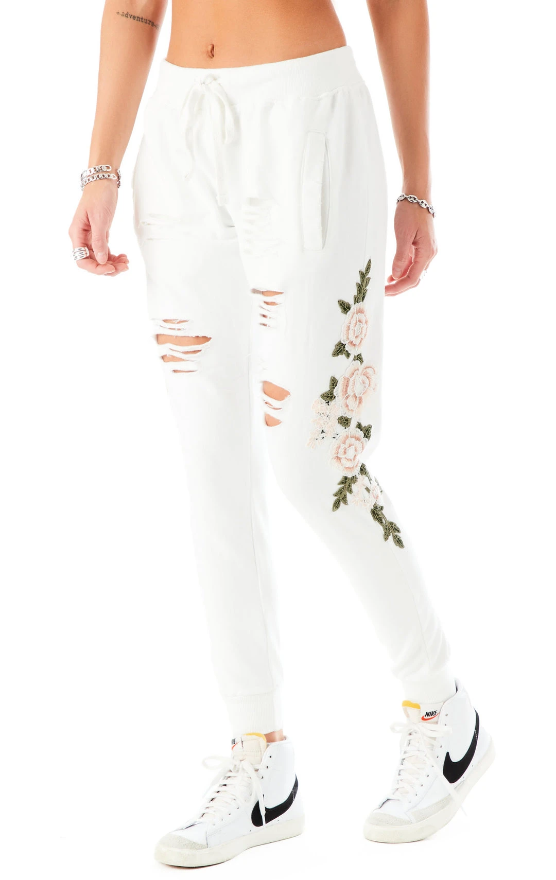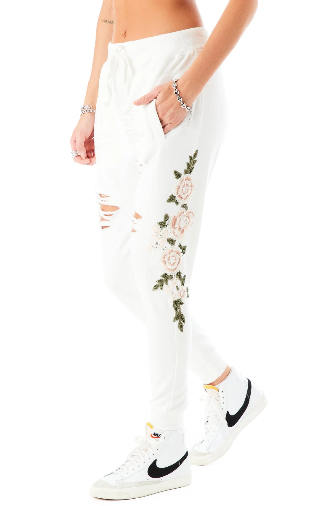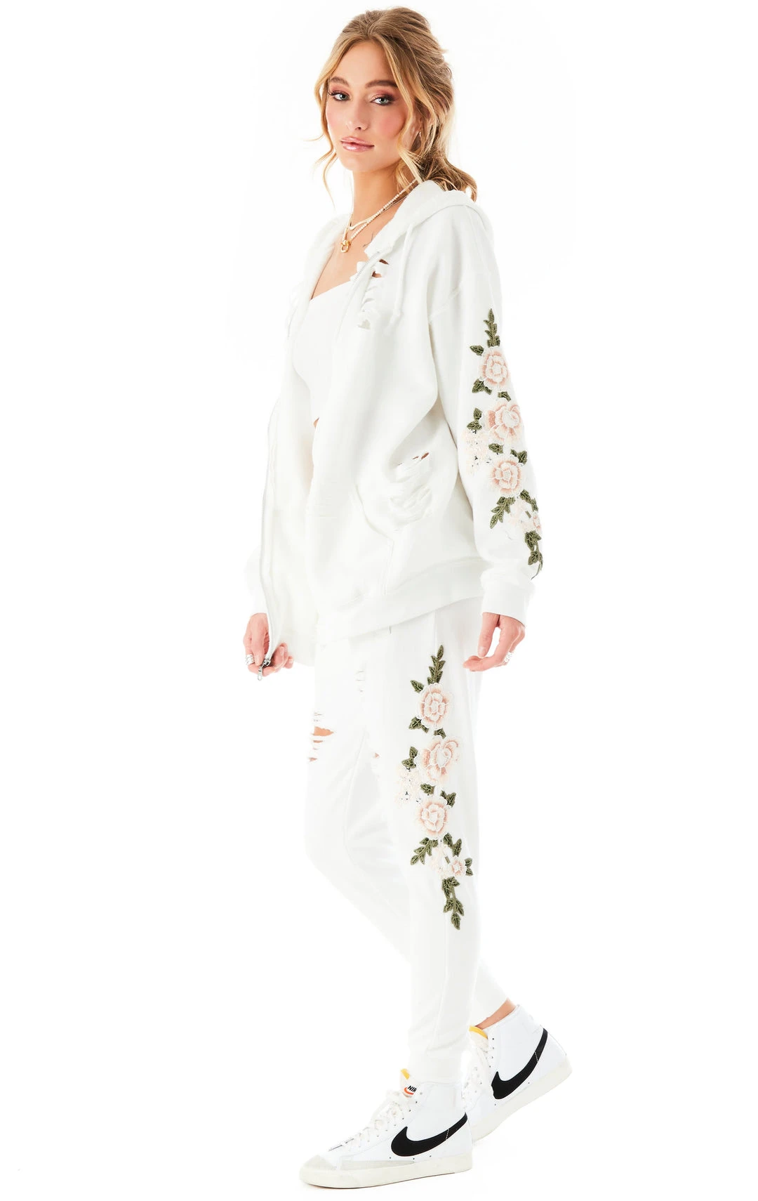If Friday night was a fit. These rose embroidered ripped sweatpants make staying in more fun. We’re spending the whole day indoors, cozy, and in sweatpants. Wbu? Life hack: a loungewear set makes you look put together with zero effort.