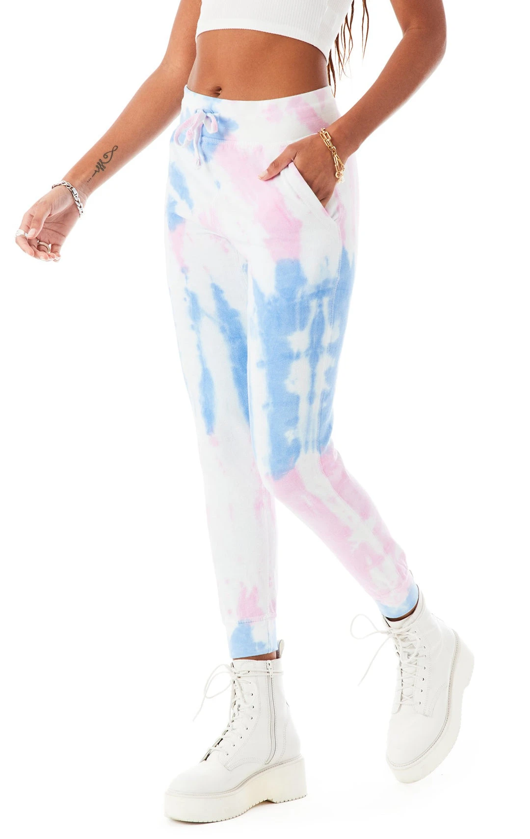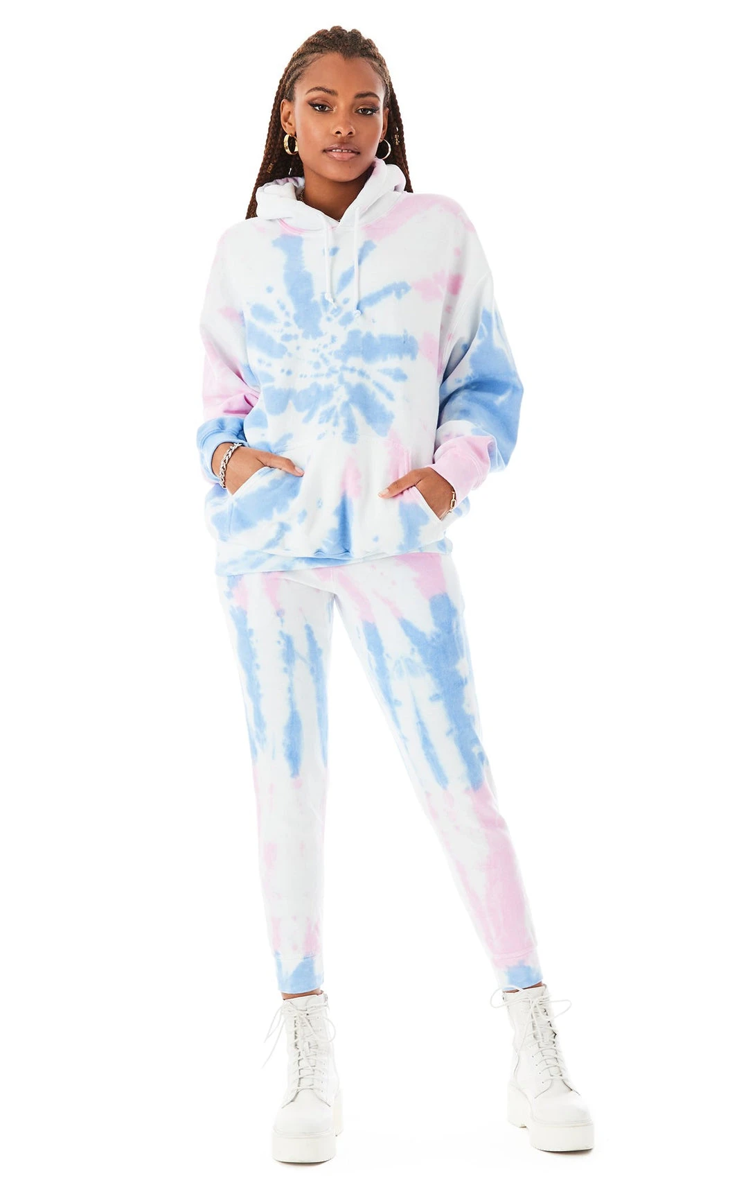 Add some fun to your wardrobe. These ultra-comfy blue and pink spiral tie dye sweatpants will be your new go-to this spring. Complete with a soft ribbed hem, drawstring waist and of course, pockets- you’re gonna be obsessed. Social distancing never looked so good until now. Get ready to distance in style.