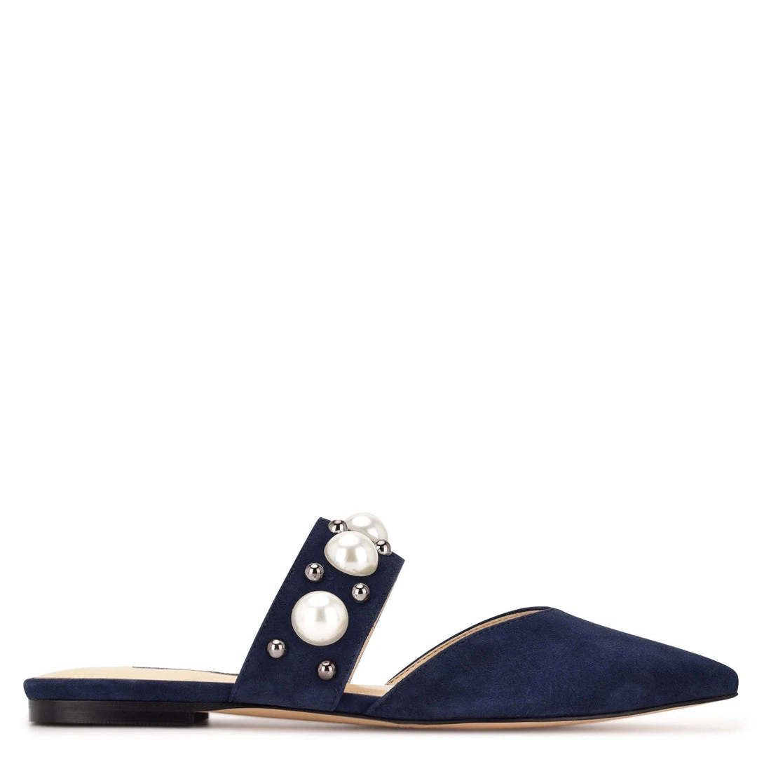 Dress it up or dress it down, the Baubble Mule is glamorous update to the classic pointed toe flat mule. These flats feature a thick strap across the upper that is embellished with oversized pearls and metallic rounded beads.