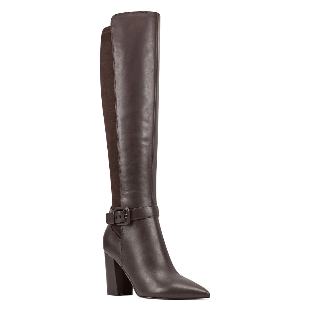 A faux buckle around the ankle lends added panache to our Collins tall boots lifted by a 3.27″ heel and featuring a leg-lengthening pointy-toe design.