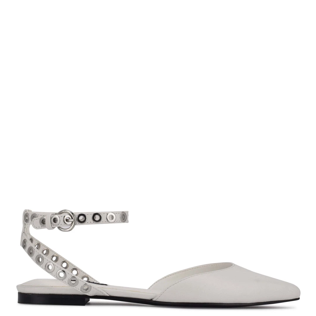 Metallic grommets on the skinny ankle strap add a touch of rock and roll the to the Brez pointed toe flat.