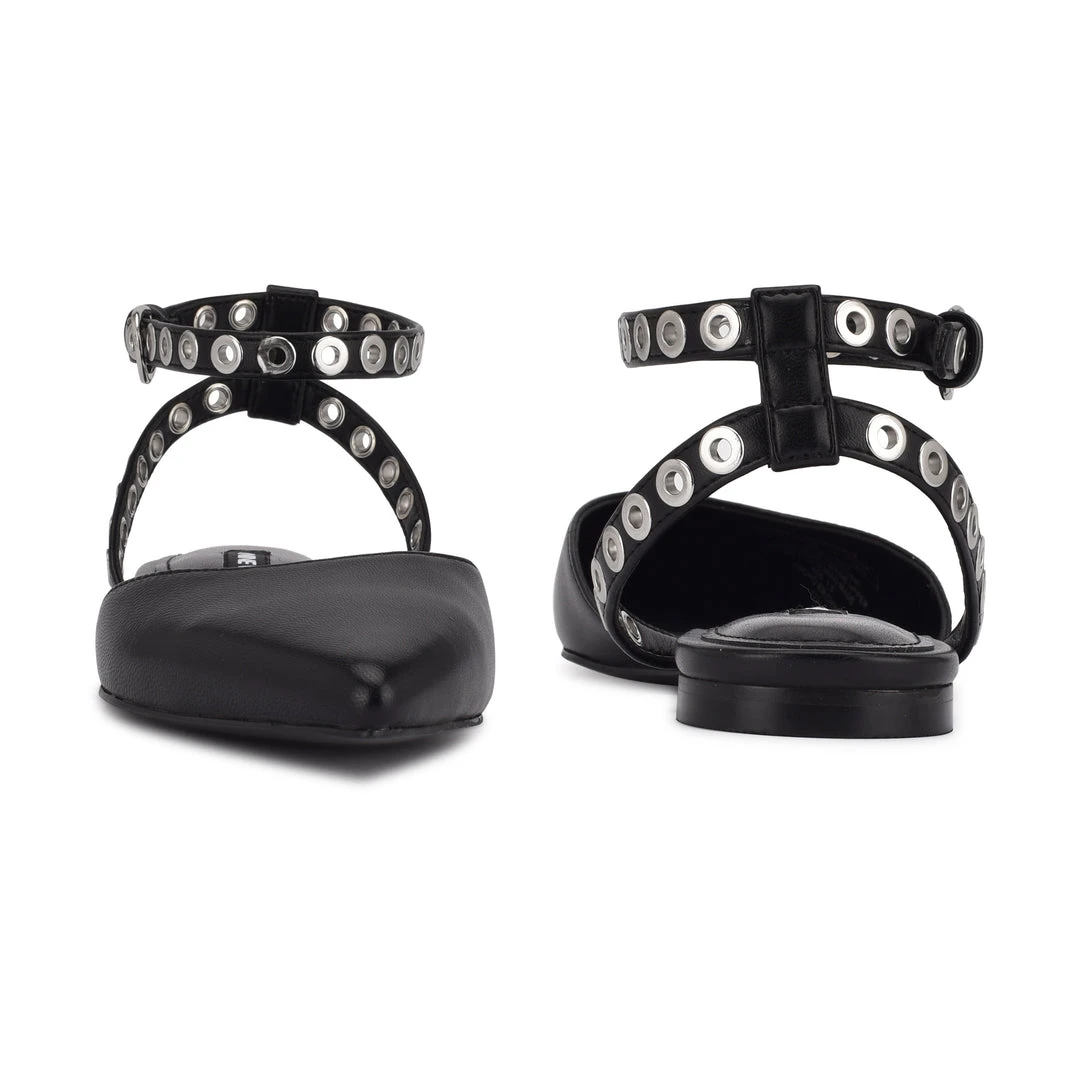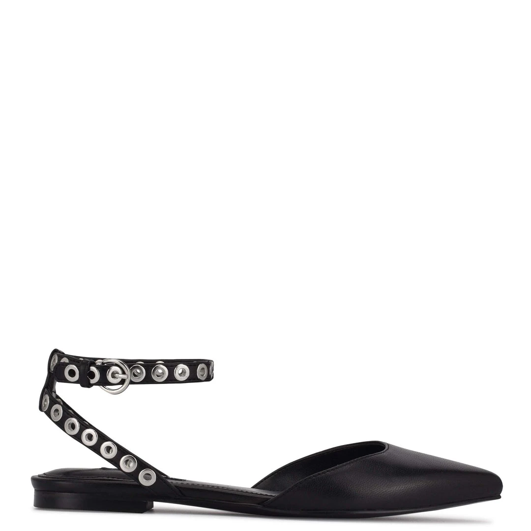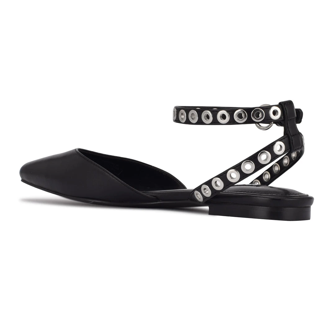 Metallic grommets on the skinny ankle strap add a touch of rock and roll the to the Brez pointed toe flat.