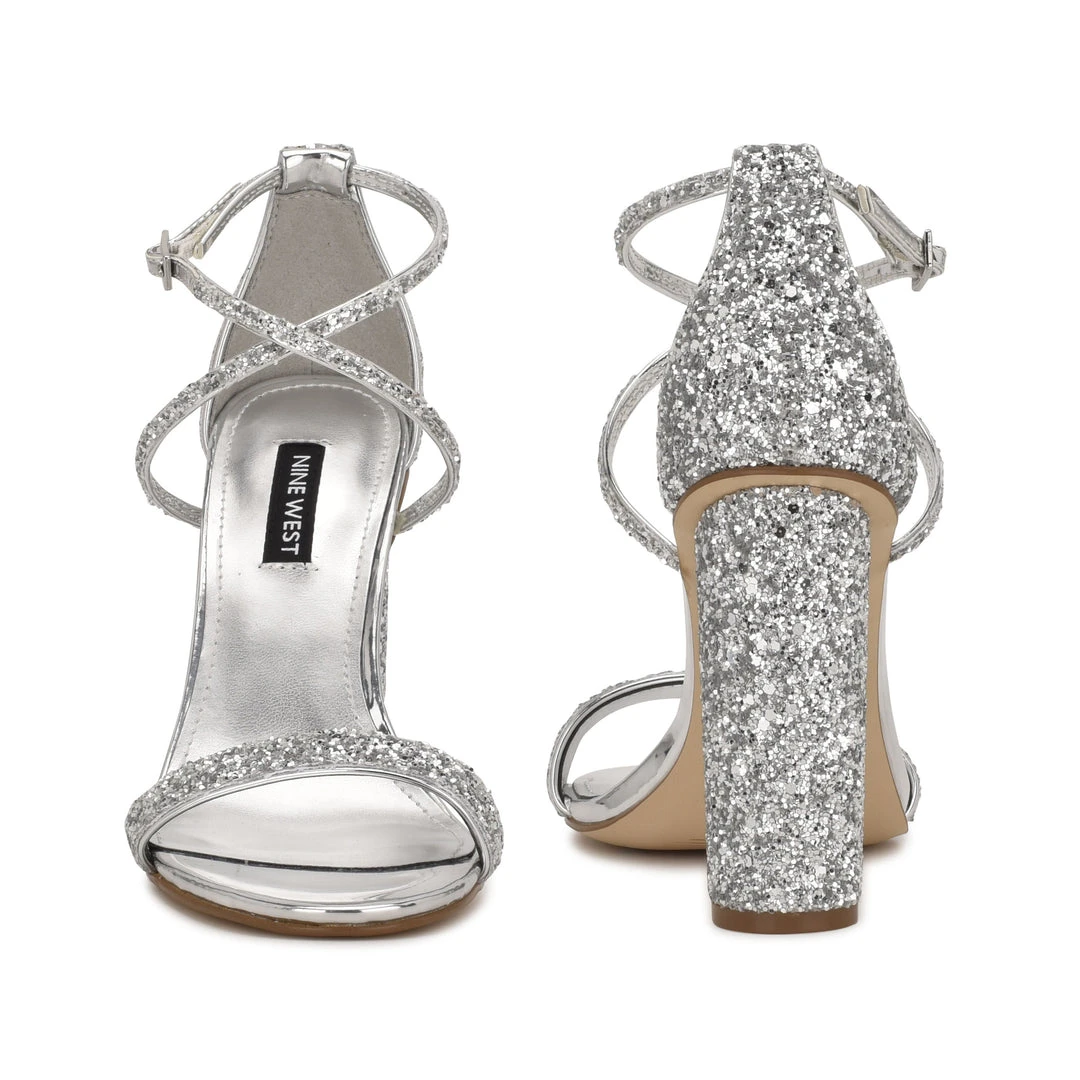 It’s time to sparkle and shine in the Celebra high heeled dress sandal. The cylindrical block heel, toe strap, and criss-cross ankle strap are covered in glamorous glitter.