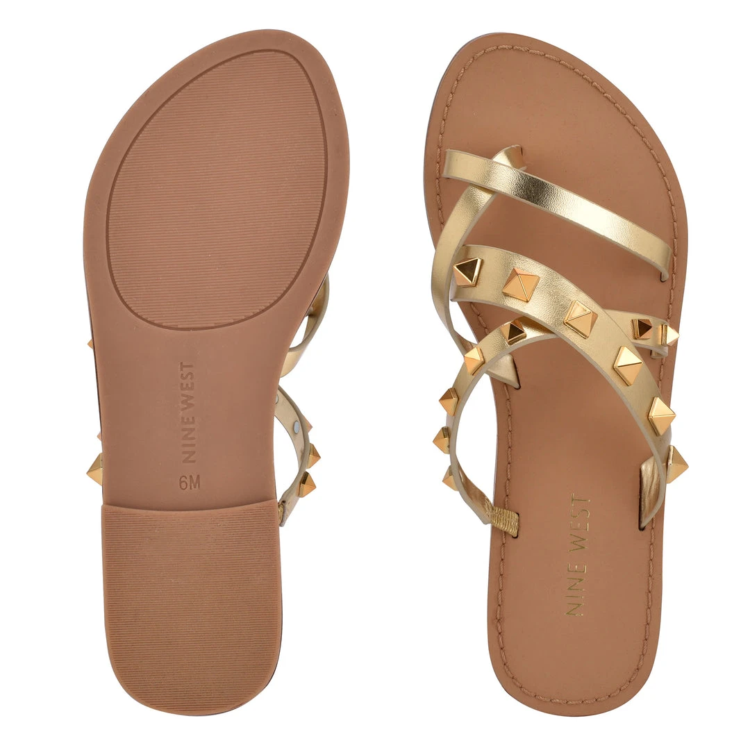 The Nine West Cerri sandal adds a touch of glam to any casual warm weather outfit. This flat sandal features asymmetrical studded criss cross straps of varying widths and a stylish toe ring design.