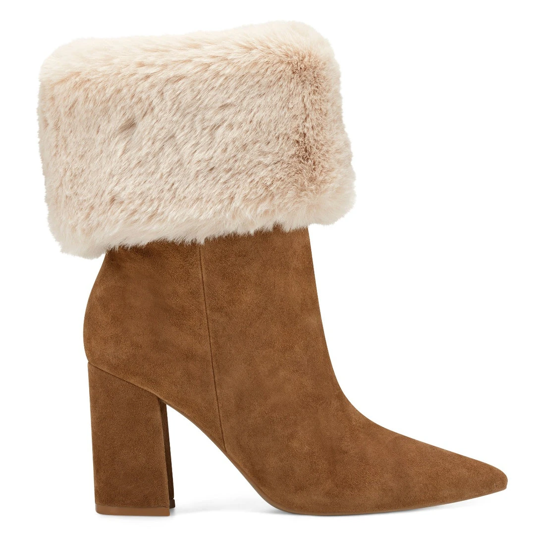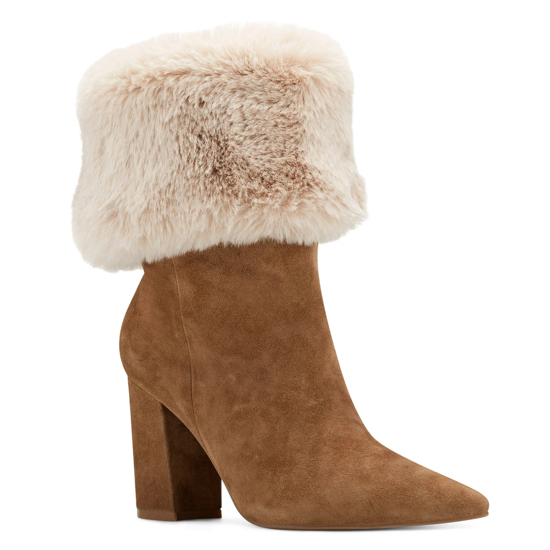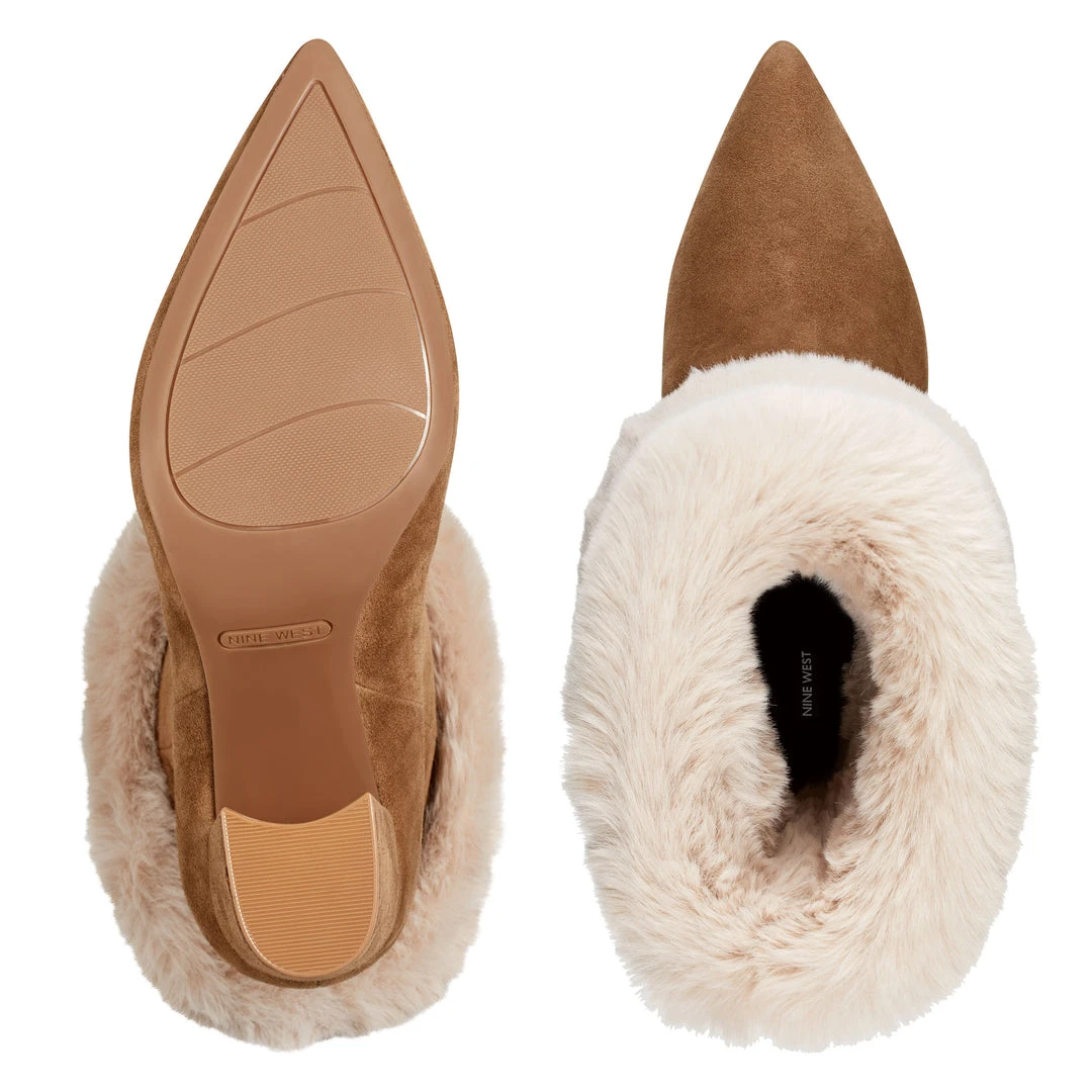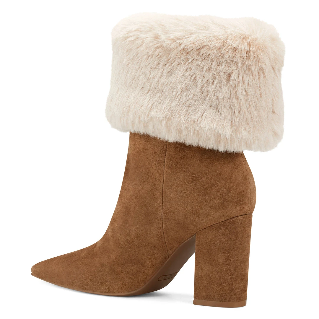 Lush faux fur surrounds the ankle of our Chrissa boots perched on a 3.5″ block heel and featuring a leg-lengthening pointy-toe design.