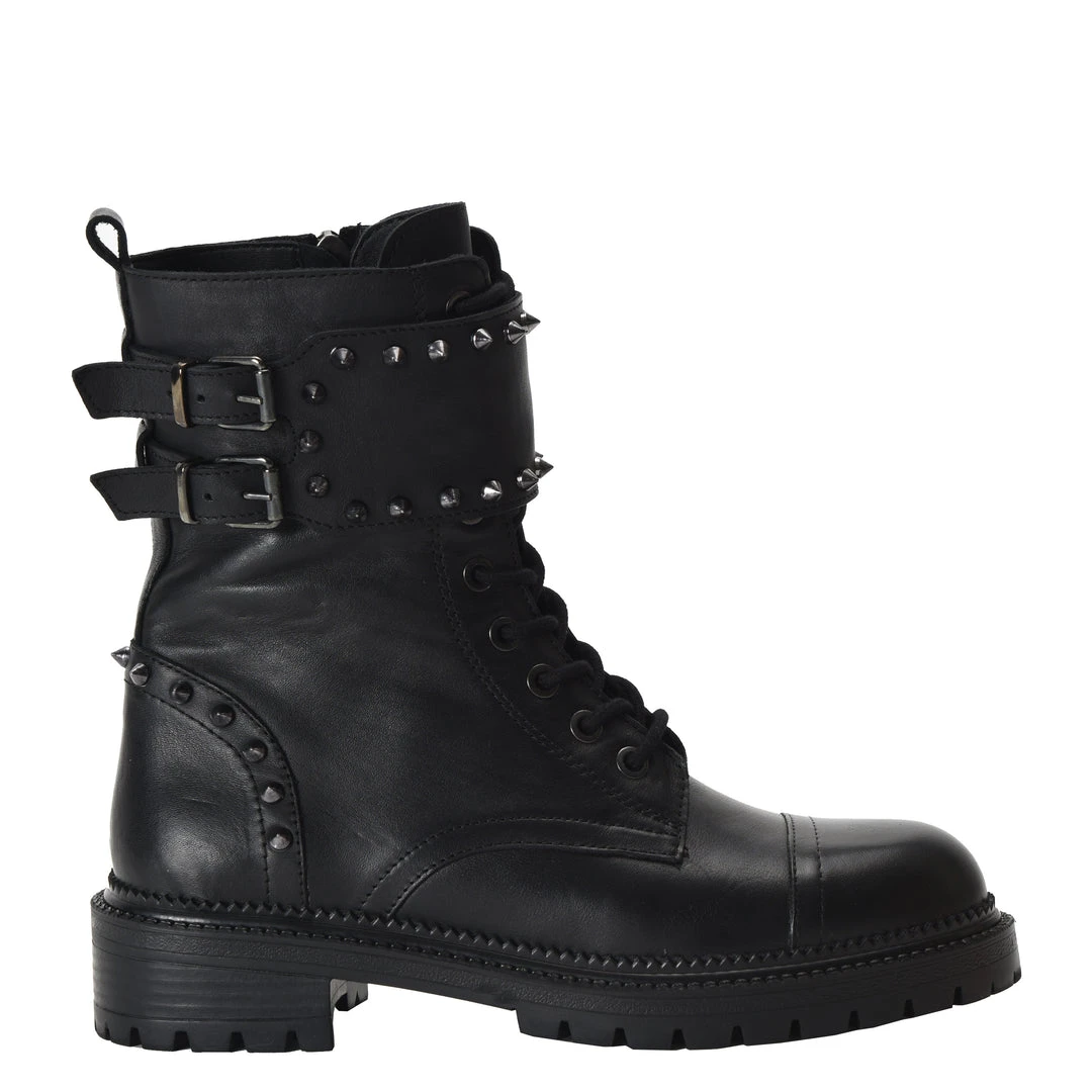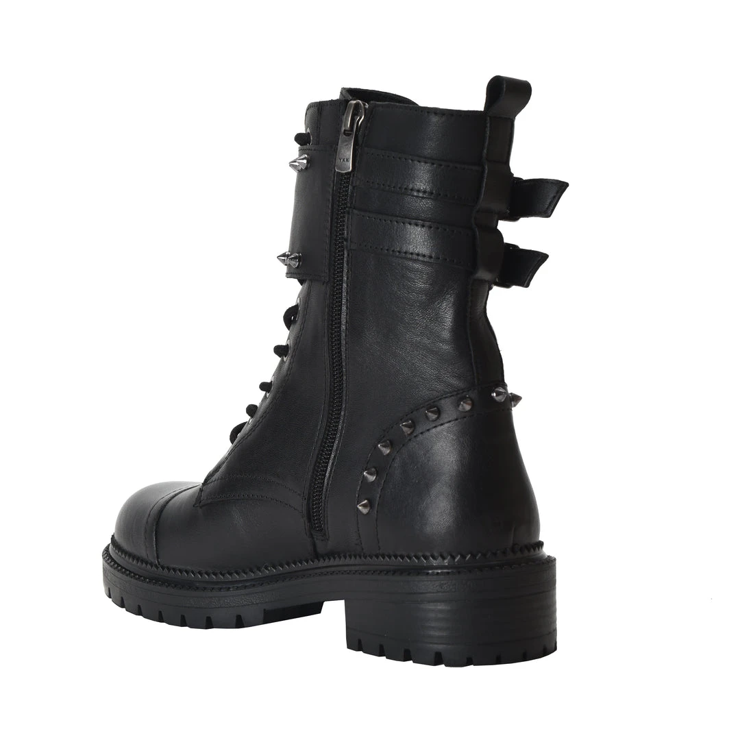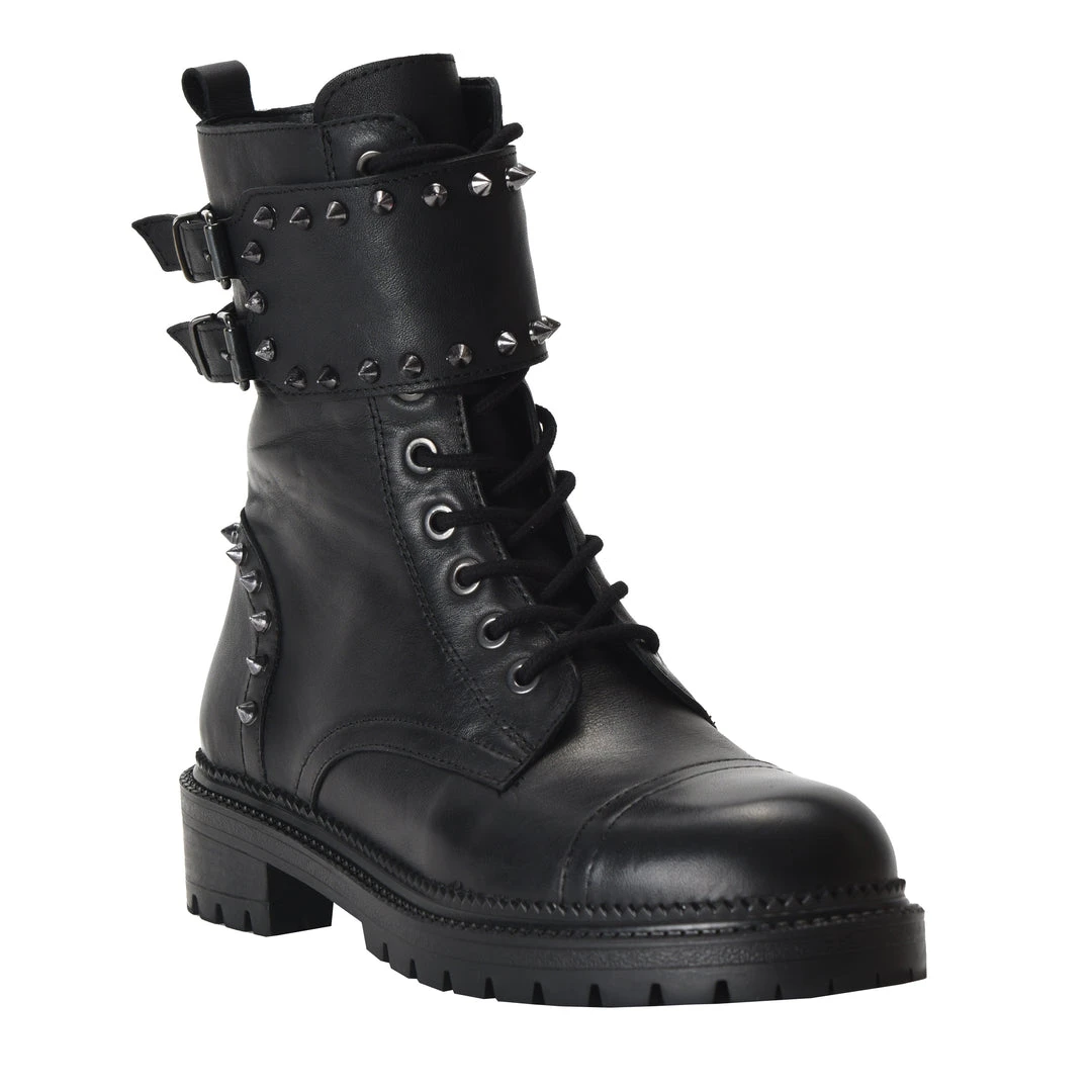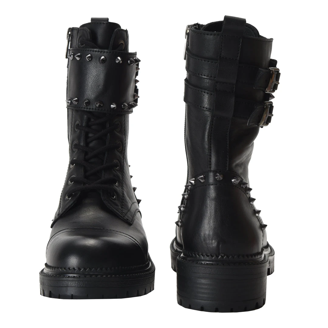 The Collie Studded Combat Lug Sole Boots are round toe boots with a low lugsole heel.