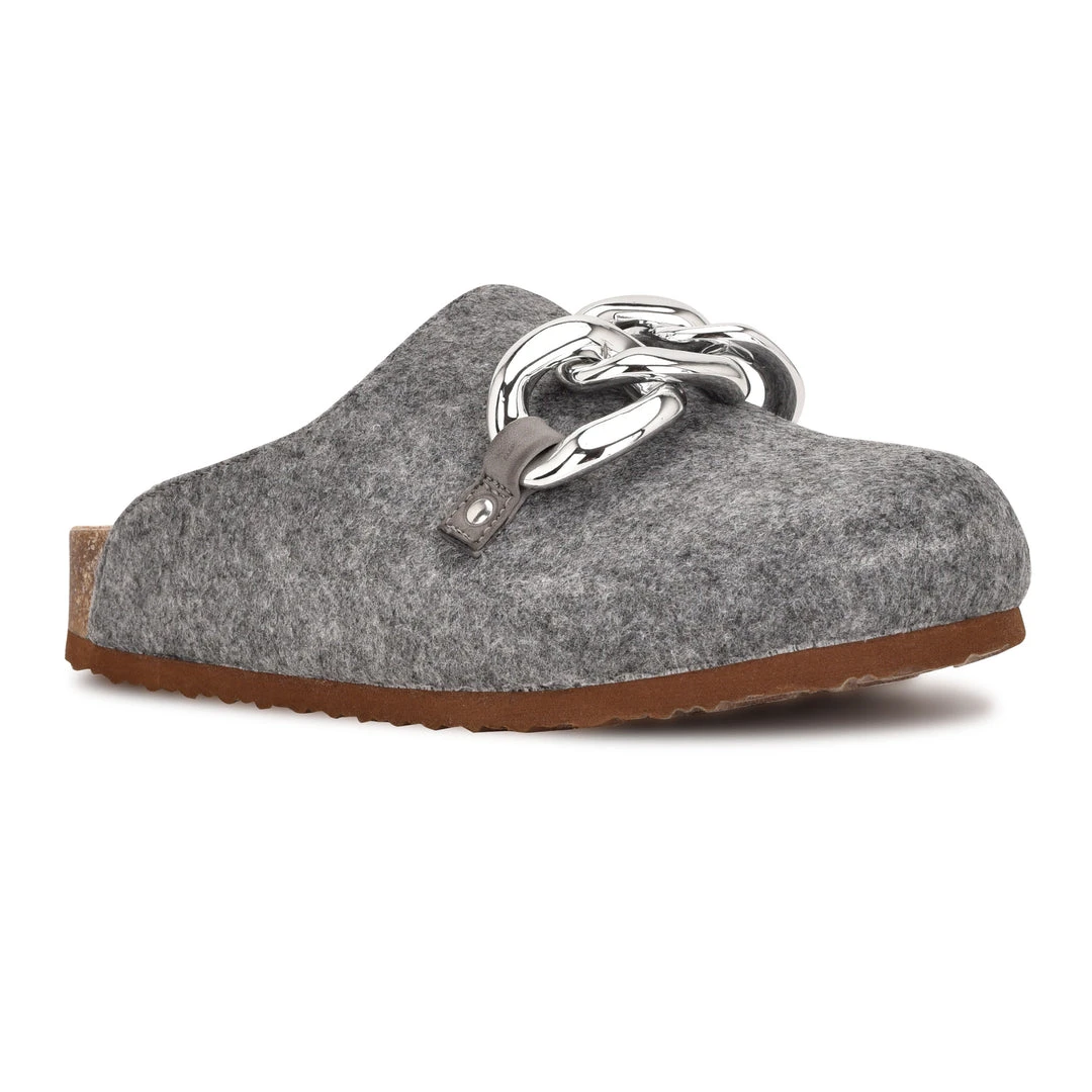 The Everyth slip on mule is a classic clog silhouette with a trendy update with an oversized metallic chain. The wool-like material gives these clogs and extra cozy feel.
