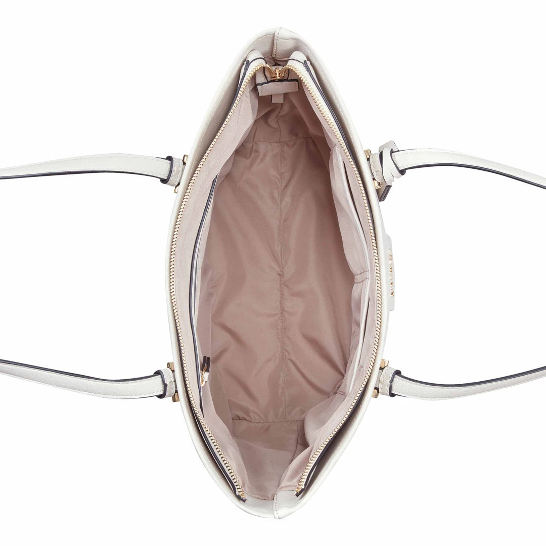 Elevated light weight tote featuring double straps and perfect for everyday. Features tripe compartment function with center zipper compartment.