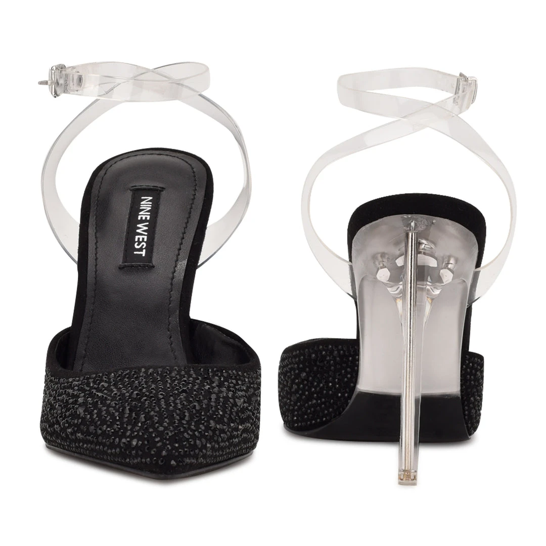 Pump up the glam with the Sparkel pointed toe pump. This pump features a trendy transparent adjustable ankle strap and sky high lucite stiletto heel. The pointed toe is embellished with tonal crystals.