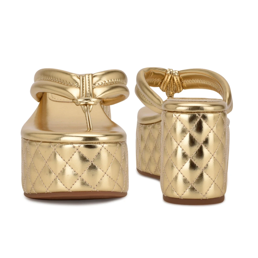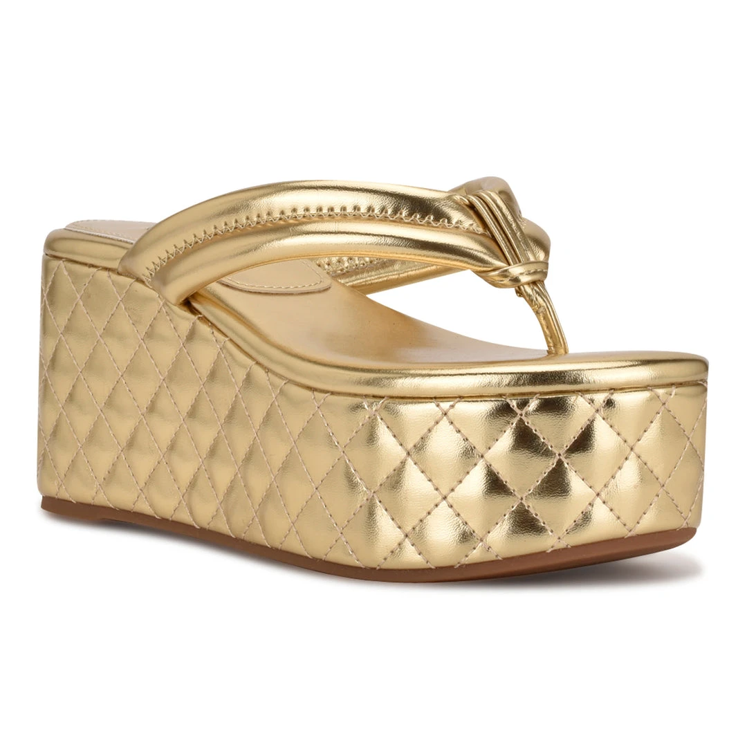 Slide into the Newya platform thong sandal for a Y2K fashion inspired look. The ultra high platform wedge is covered in a quilted pattern and the wide upper straps are stitched to create a trendy puffy look and feel.
