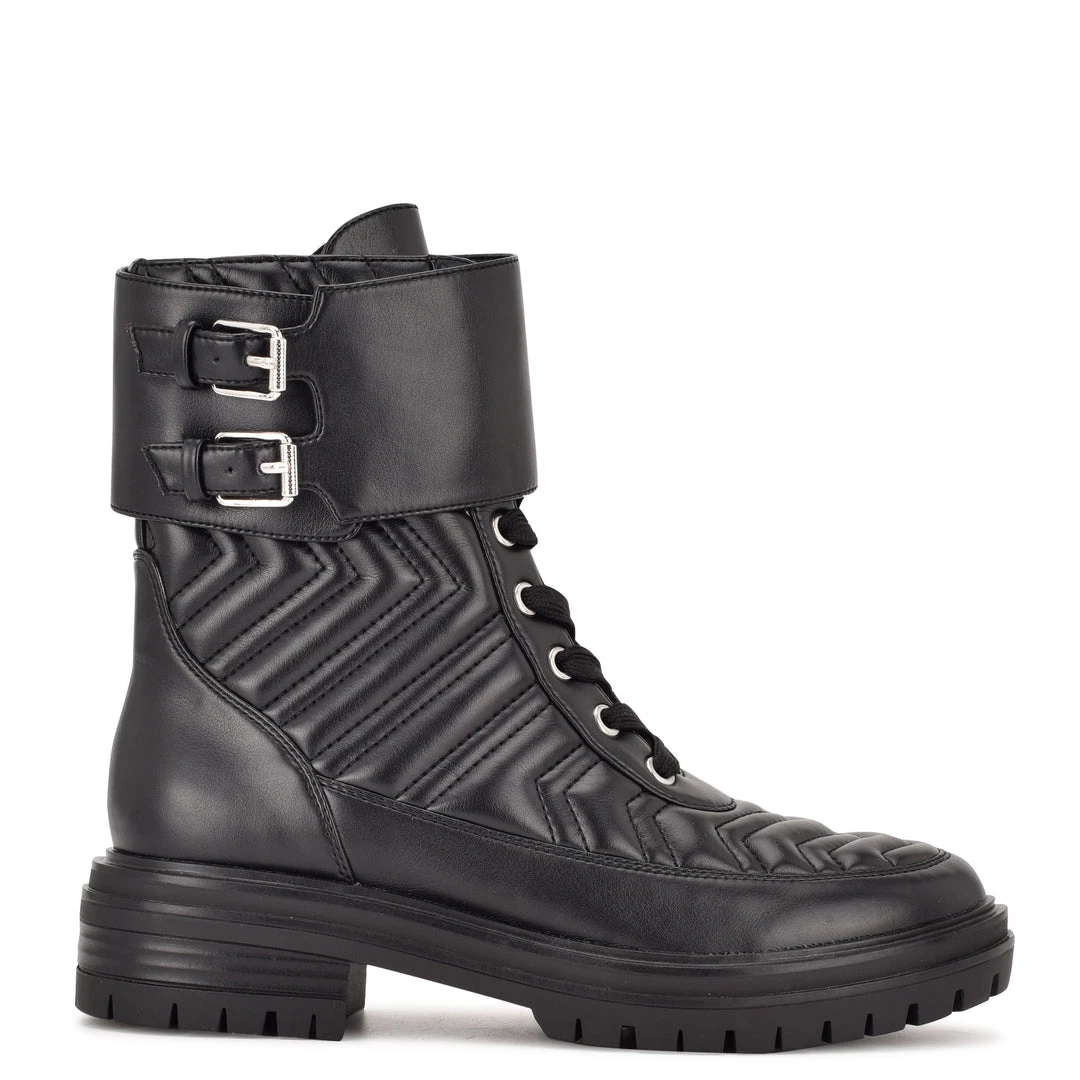 The Sabrah boot is a modern take on the classic combat boot silhouette with its quilted chevron stitching and double buckle strap around the ankle.