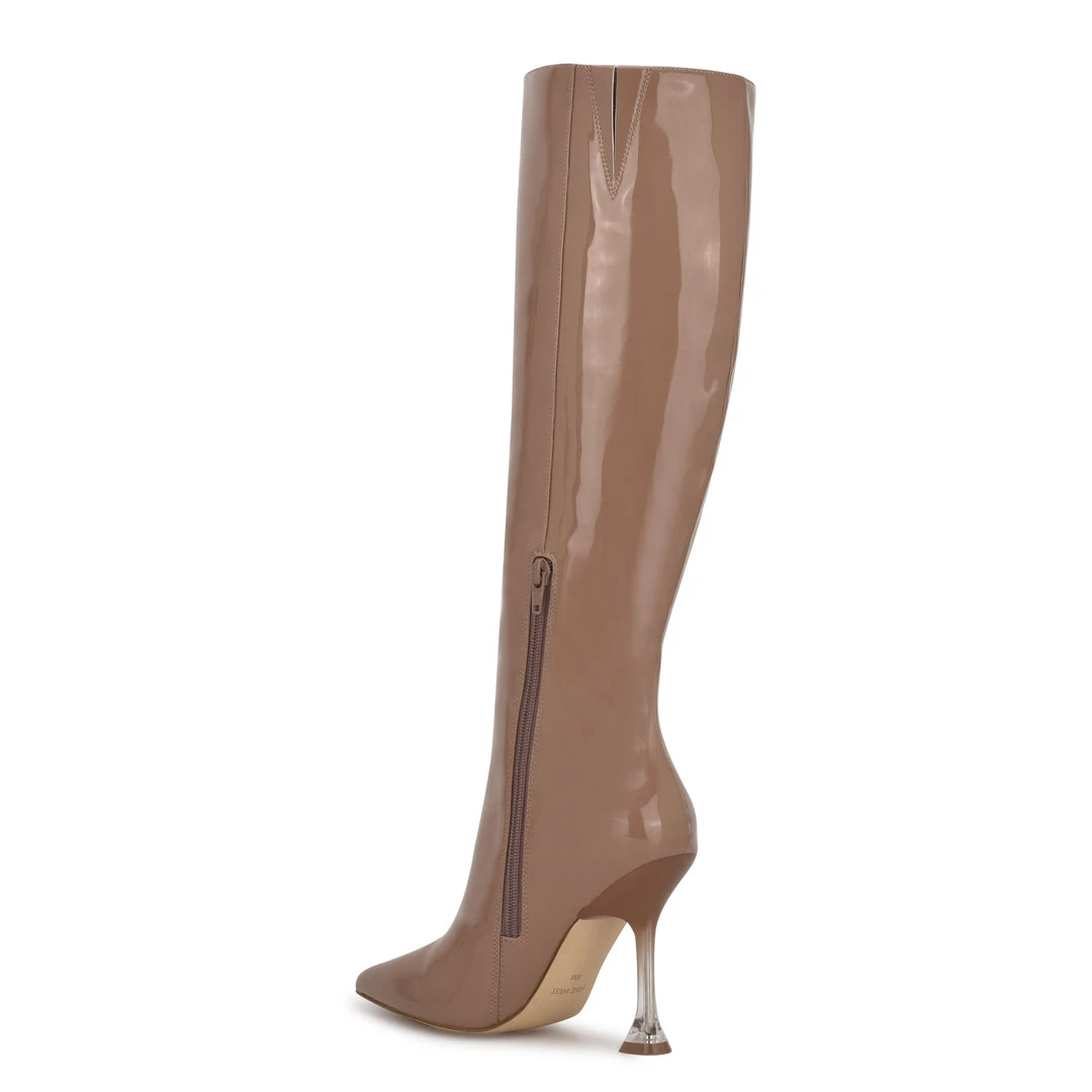 Step out in style with the sexy Tayla knee high boot. This pointed toe sky high boot features a trendy Lucite sculpted heel that is sure to impress.