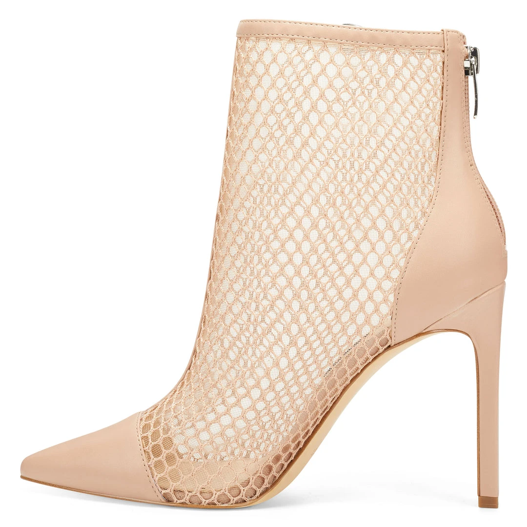 A capped pointy toe and a mesh body highlight our Tawny booties lifted by a towering 3.94″ heel. A back zip makes it easy to slip Tawny on and off.