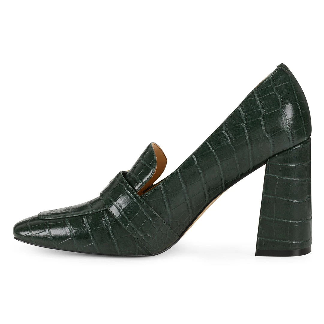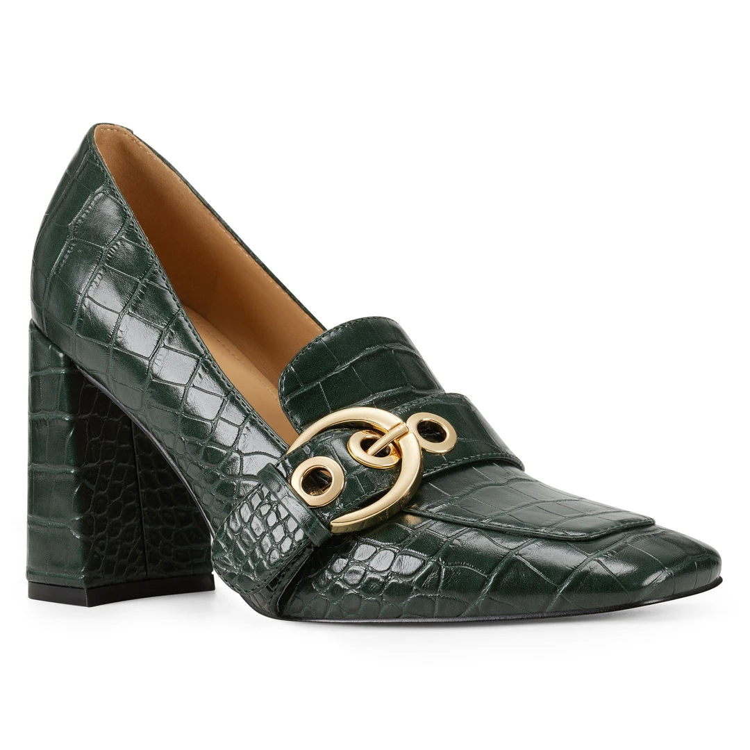 Glistening metallic hardware crosses the vamp of our Urila square-toe loafer lifted by a blocked mid heel.