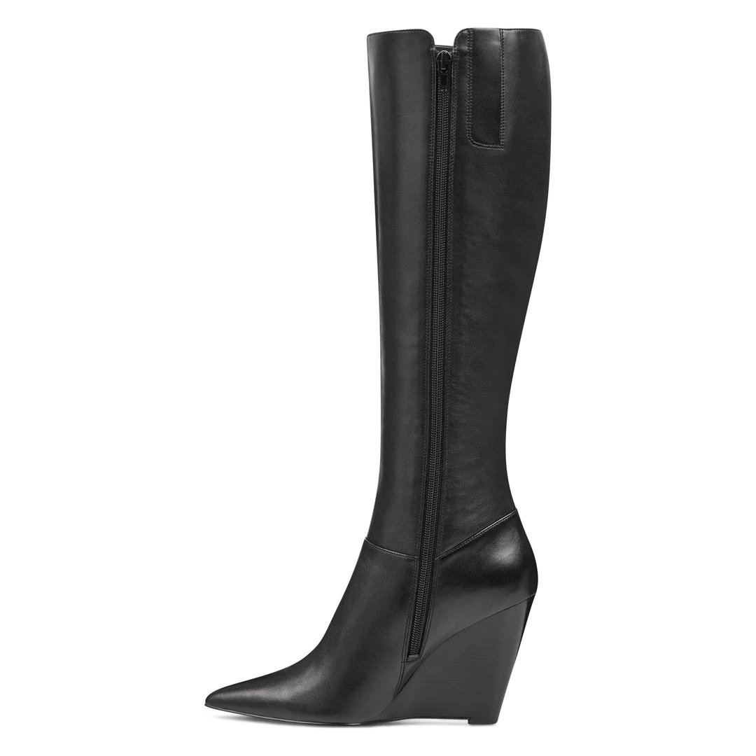 A clean-lined, leg-lengthening pointy-toe boot is beautifully balanced with a stacked 3 1/2″ wedge heel. A full side zipper makes it easy to slip Varin on and off.