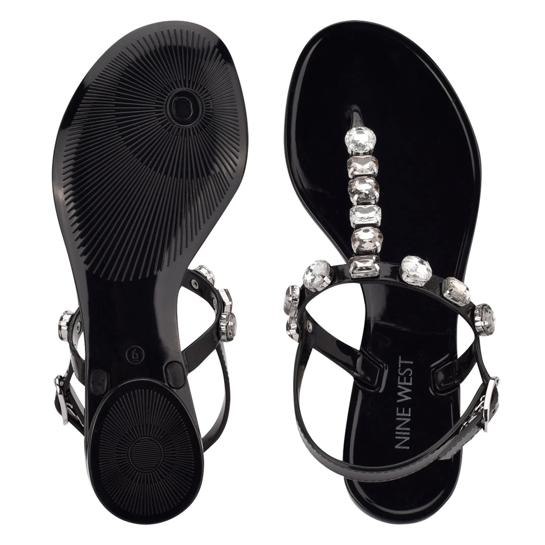 The Nine West Juniper t-strap jelly sandal is a trendy and fun shoe perfect for dressing up your favorite casual outfit. Oversized gem stones adorn the t-strap and add glamour to this classic silhouette.